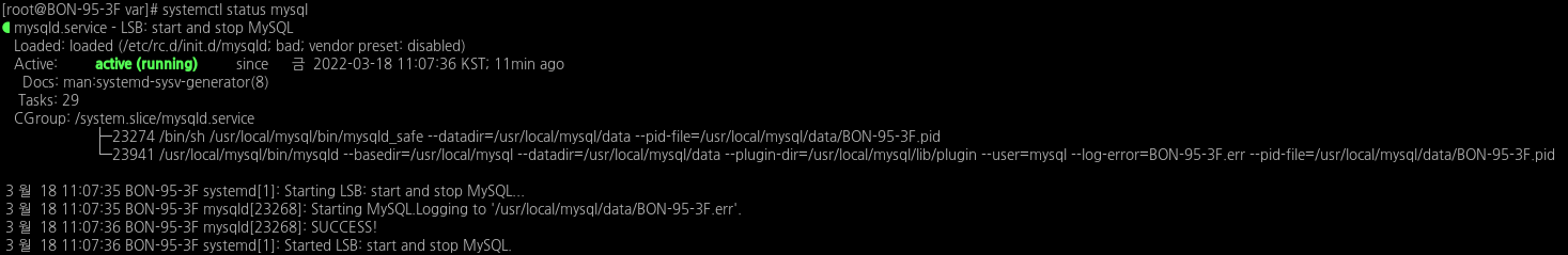 1월 13 13:27:39 mysqld[17186]: Starting MySQL.2023-01-13T04:27:39.660431Z mysqld_safe error: log-error set to '/var/log/mysqld/mysqld.log', however file don't exists. Create wr... user 'mysql'.