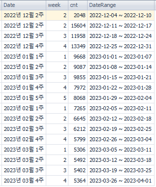 오라클에는 아래 쿼리처럼, 함수가 있어서 포맷만 지정하면 편하게 사용할 수 있지만 mysql 에서 주별로 데이터를 조회하려면 함수가 없어서 직접 작성해주어야한다.