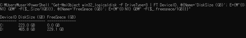 >PowerShell "Get-WmiObject win32_logicaldisk -F DriveType=3 | FT DeviceID, @{Name='DiskSize (GB)'; E={\"{0:N1} GB\" -F($_.Size/1GB)}}, @{Name='FreeSpace (GB)'; E={\"{0:N1} GB\" -F($_.freespace/1GB)}}"