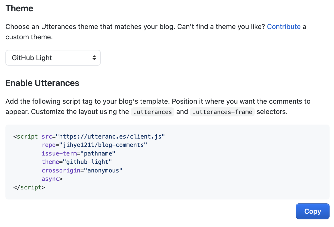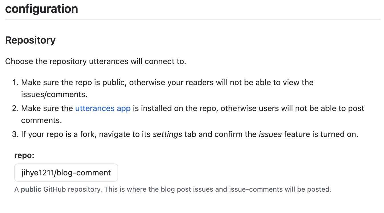 repo에 새로 생성한 레포지토리를 입력한다. (jihye1211/blog-comments)