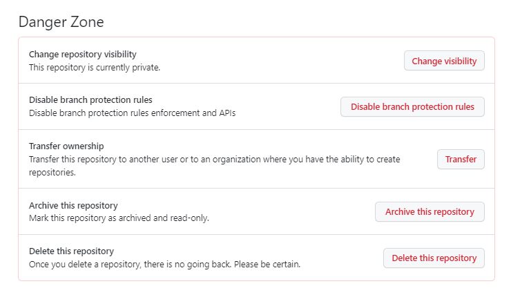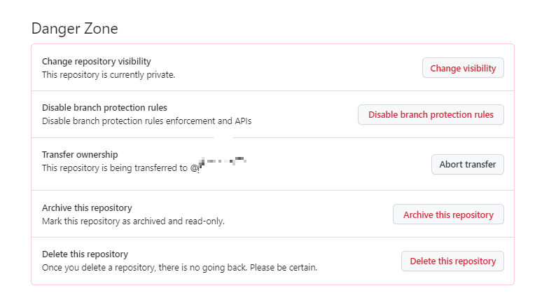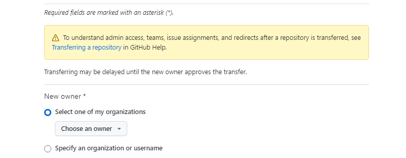 Setting 에 들어가면 General 하단에 Danger Zone에 Transfer ownership을 통해 소유권을 이전할 수 있다.