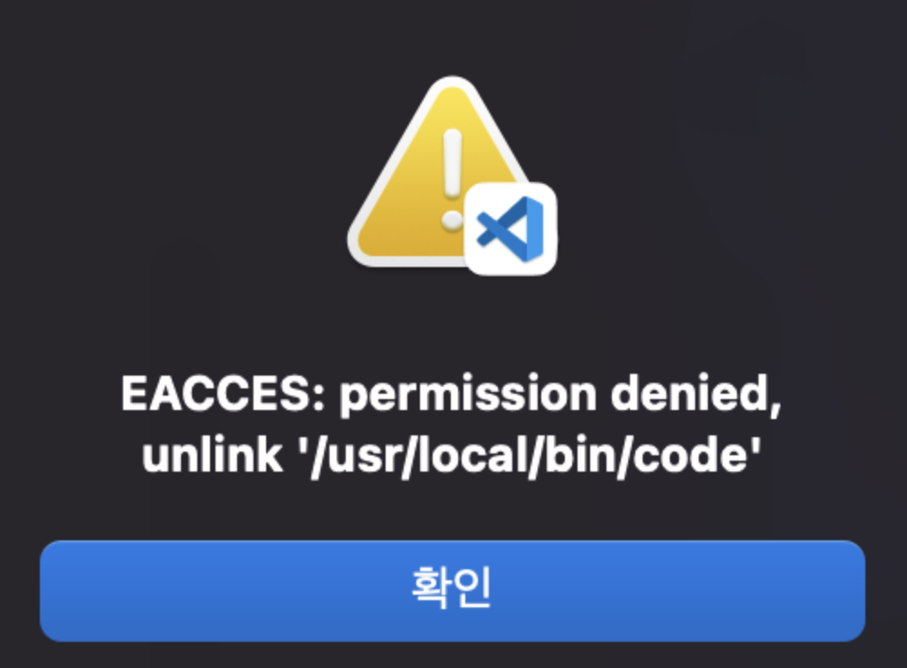 만약 아래 화면처럼 에러가 발생했을 경우, 메세지 내용처럼 '/usr/local/bin/code/'를 삭제해주면 된다.