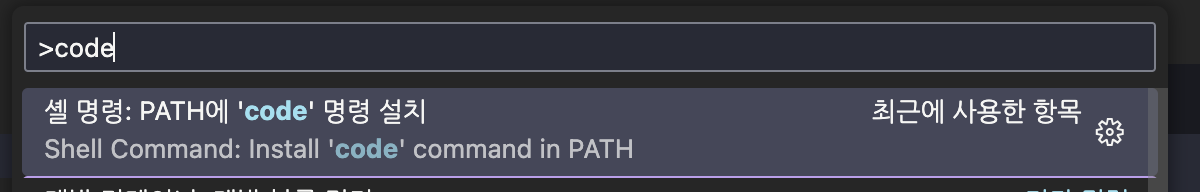 vsc에서 cmd+shift+P를 눌러 명령 팔레트를 실행한 후 code를 검색한다.
