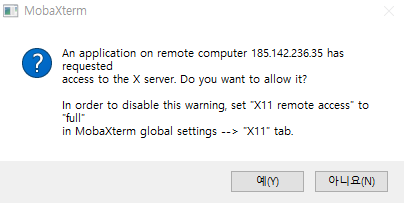 원격 컴퓨터 185.142.236.35에서 X 서버에 대한 액세스를 요청했습니다. 허용하시겠습니까?