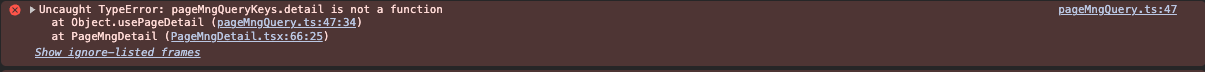 즉, pageMngQueryKeys는 아직 완전히 만들어지지 않았는데 그걸 내부에서 쓰고 있음 → undefined.all → 런타임 에러