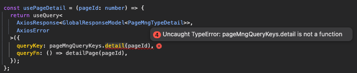 즉, pageMngQueryKeys는 아직 완전히 만들어지지 않았는데 그걸 내부에서 쓰고 있음 → undefined.all → 런타임 에러