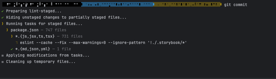 - 이렇게 생성된 브랜치에서 `git commit`을 시도하면, `pre-commit` 훅에 설정된 `lint-staged`가 실행된다.