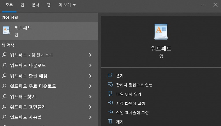연결 프로그램으로 바로 실행하려 했으나, 관리자 권한 실행이 안되서 워드패드를 검색해 준 후 관리자 권한으로 실행 한다.