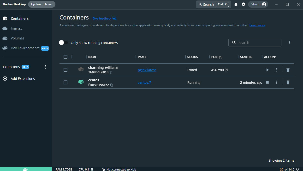 도커 데스크탑에서도 실행 중인걸 확인할 수 있다! (Running / 파란색으로 표시됨)