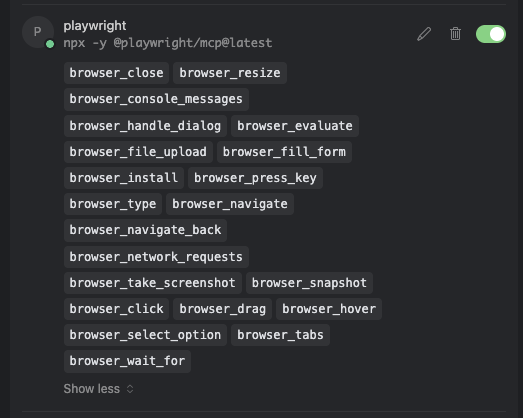 저 부분을 "@playwright/mcp@latest"로 수정하니 정상적으로 로딩되었다.