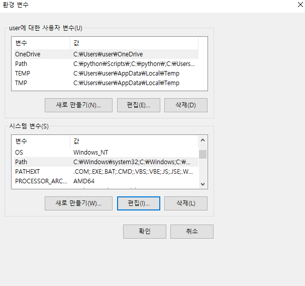 검색 > 환경변수 > 시스템 속성 > 환경 변수 > 시스템 변수 > path 편집